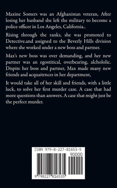 Maxine Somers was an Afghanistan veteran, After losing her husband she left the military to become a police officer in Los Angeles, California.. Rising through the ranks, she was promoted to Detective.and assigned to the Beverly Hills division where she worked under a new boss and partner. Max's new boss was over demanding, and her new partner was an egostitical, overbearing, alchololic. Dispite her boss and partner, Max made many new friends and acquaitrnces in her department, It would take all of her skill and friends, with a little luck, to solve her first murder case. A case that had more questions than answers. A case that might just be the perfect murder.