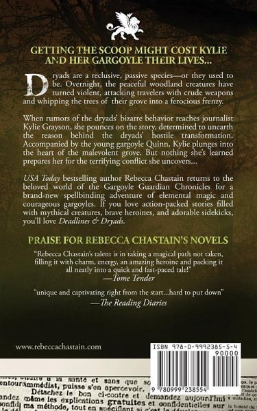 Getting the scoop might cost Kylie and her gargoyle their lives... Dryads are a reclusive, passive species-or they used to be. Overnight, the peaceful woodland creatures have turned violent, attacking travelers with crude weapons and whipping the trees of their grove into a ferocious frenzy. When rumors of the dryads' bizarre behavior reaches journalist Kylie Grayson, she pounces on the story, determined to unearth the reason behind the dryads' hostile transformation. Accompanied by the young gargoyle Quinn, Kylie plunges into the heart of the malevolent grove. But nothing she's learned prepares her for the terrifying conflict she uncovers... USA Today bestselling author Rebecca Chastain returns to the beloved world of the Gargoyle Guardian Chronicles for a brand-new spellbinding adventure of elemental magic and courageous gargoyles. If you love action-packed stories filled with mythical creatures, brave heroines, and adorable sidekicks, you'll love Deadlines & Dryads. Pick up your copy today to start the magical adventure! Deadlines & Dryads is a standalone novel and does not require you to read the Gargoyle Guardian Chronicles trilogy first...but it will make you want to read it when you finish.