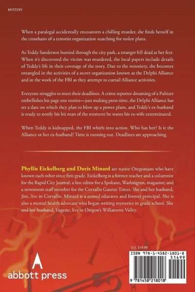 When a paralegal accidentally encounters a chilling murder, she finds herself in the crosshairs of a terrorist organization searching for stolen plans. As Teddy Sanderson hurries through the city park, a pedestrian bumps against her-and then falls dead at her feet. When it's discovered the victim was murdered, the local papers share the details of Teddy's life, making her vulnerable to attacks from crackpots around town and from her paroled ex-husband, who wants her dead. Due to the notoriety of the case, Teddy becomes entangled in the activities of a secret organization known as the Delphi Alliance and in the work of the FBI as they attempt to curtail Alliance plans. Meanwhile, everyone is struggling to meet deadlines. A crime reporter is attempting to gain a Pulitzer Prize by writing award-winning page-one stories, the Delphi Alliance has a specific date on which they plan to blow up a power plant, and Teddy's ex-husband is ready to notify his hit man of the date he wants Teddy exterminated. When Teddy and the crime reporter are kidnapped, however, the FBI whirls into action, trying to decide who has them-the Alliance or Teddy's ex-husband-before their time runs out.