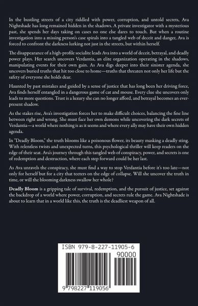 In the bustling streets of a city riddled with power, corruption, and untold secrets, Ava Nightshade has long remained hidden in the shadows. A private investigator with a mysterious past, she spends her days taking on cases no one else dares to touch. But when a routine investigation into a missing person's case spirals into a tangled web of deceit and danger, Ava is forced to confront the darkness lurking not just in the streets, but within herself. The disappearance of a high-profile socialite leads Ava into a world of deceit, betrayal, and deadly power plays. Her search uncovers Verdantia, an elite organization operating in the shadows, manipulating events for their own gain. As Ava digs deeper into their sinister agenda, she uncovers buried truths that hit too close to home-truths that threaten not only her life but the safety of everyone she holds dear. Haunted by past mistakes and guided by a sense of justice that has long been her driving force, Ava finds herself entangled in a dangerous game of cat and mouse. Every clue she uncovers only leads to more questions. Trust is a luxury she can no longer afford, and betrayal becomes an ever-present shadow. As the stakes rise, Ava's investigation forces her to make difficult choices, balancing the fine line between right and wrong. She must face her own demons while uncovering the dark secrets of Verdantia-a world where nothing is as it seems and where every ally may have their own hidden agenda. In "Deadly Bloom," the truth blooms like a poisonous flower, its beauty masking a deadly sting. With relentless twists and unexpected turns, this psychological thriller will keep readers on the edge of their seat. Ava's journey through this tangled web of conspiracy, power, and secrets is one of redemption and destruction, where each step forward could be her last. As Ava unravels the conspiracy, she must find a way to stop Verdantia before it's too late-not only for herself but for a city that teeters on the edge of collapse. Will she uncover the truth in time, or will the blooming darkness swallow her whole? Deadly Bloom is a gripping tale of survival, redemption, and the pursuit of justice, set against the backdrop of a world where power, corruption, and secrets rule the game. Ava Nightshade is about to learn that in a world like this, the truth is the deadliest weapon of all.