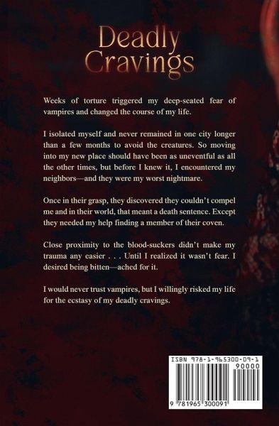 Weeks of torture triggered my deep-seated fear of vampires and changed the course of my life. I isolated myself and never remained in one city longer than a few months to avoid the creatures. So moving into my new place should have been as uneventful as all the other times, but before I knew it, I encountered my neighbors-and they were my worst nightmare. Once in their grasp, they discovered they couldn't compel me and in their world, that meant a death sentence. Except they needed my help finding a member of their coven. Close proximity to the blood-suckers didn't make my trauma any easier . . . Until I realized it wasn't fear. I desired being bitten-ached for it. I would never trust vampires, but I willingly risked my life for the ecstasy of my deadly cravings.