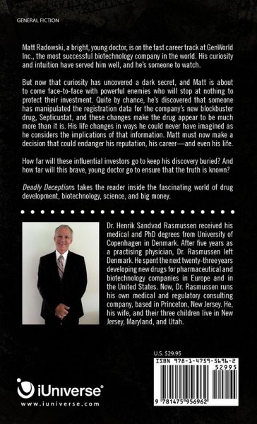 Matt Radowski, a bright, young doctor, is on the fast career track at GenWorld Inc., the most successful biotechnology company in the world. His curiosity and intuition have served him well, and he's someone to watch. But now that curiosity has uncovered a dark secret, and Matt is about to come face-to-face with powerful enemies who will stop at nothing to protect their investment. Quite by chance, he's discovered that someone has manipulated the registration data for the company's new blockbuster drug, Septicustat, and these changes make the drug appear to be much more than it is. His life changes in ways he could never have imagined as he considers the implications of that information. Matt must now make a decision that could endanger his reputation, his career-and even his life. How far will these influential investors go to keep his discovery buried? And how far will this brave, young doctor go to ensure that the truth is known? Deadly Deceptions takes the reader inside the fascinating world of drug development, biotechnology, science, and big money.