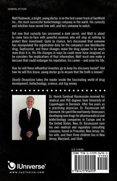 Matt Radowski, a bright, young doctor, is on the fast career track at GenWorld Inc., the most successful biotechnology company in the world. His curiosity and intuition have served him well, and he's someone to watch. But now that curiosity has uncovered a dark secret, and Matt is about to come face-to-face with powerful enemies who will stop at nothing to protect their investment. Quite by chance, he's discovered that someone has manipulated the registration data for the company's new blockbuster drug, Septicustat, and these changes make the drug appear to be much more than it is. His life changes in ways he could never have imagined as he considers the implications of that information. Matt must now make a decision that could endanger his reputation, his career-and even his life. How far will these influential investors go to keep his discovery buried? And how far will this brave, young doctor go to ensure that the truth is known? Deadly Deceptions takes the reader inside the fascinating world of drug development, biotechnology, science, and big money.