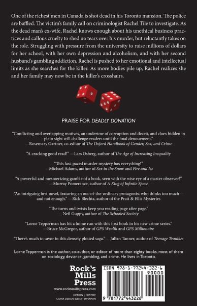 One of the richest men in Canada is shot dead in his Toronto mansion. The police are baffled. The victim's family call on Rachel Tile, head of the school of criminology at a Toronto university, to conduct an investigation. As the dead man's ex-wife, Rachel knows enough about his unethical business practices and callous cruelty to shed no tears over his murder, but reluctantly takes on the role. Struggling with pressure from the university to raise millions of dollars for her school, with her own depression and alcoholism, and with her husband's gambling addiction, Rachel is pushed to her emotional and intellectual limits as she searches for the killer. As more bodies begin to pile up, Rachel realizes she and her family may now be in the killer's crosshairs. ADVANCE REVIEWS OF DEADLY DONATION "Lorne Tepperman draws on years of experience studying crime, gambling, and family relations in crafting this neo-noir thriller. Conflicting and overlapping motives, an undertow of corruption and deceit, and clues hidden in plain sight will challenge readers until the final denouement." ---Rosemary Gartner, co-editor of The Oxford Handbook of Gender, Sex, and Crime "This fast-paced murder mystery has everything: sex, violence, incest, gambling, addiction, marital betrayal, a nasty (and wealthy) victim and a myriad suspects, including the protagonist. Add in Norse mythology and a denouement that is both surprising and inevitable, and you have a book impossible to put down." ---Michael Adams, author of Sex in the Snow and Fire and Ice "A powerful and mesmerizing gamble of a book, seen with the wise eye of a master observer!" ---Murray Pomerance, author of A King of Infinite Space "An intriguing first novel, featuring an out-of-the-ordinary protagonist who thinks too much---and not enough." ---Rick Blechta, award-winning author of the Pratt & Ellis Mysteries "A well-paced thriller with intriguing labyrinthian complexity. The turns and twists keep you reading page after page after page." -Neil Guppy, author of The Schooled Society "Lorne Tepperman has hit a home run with this first book in his new crime series." ---Bruce McGregor, author of GPS Wealth and GPS Millionaire "A cracking good read! Very fun reading---with a fine eye for the dark side of big money at the top." ---Lars Osberg, author of The Age of Increasing Inequality: The Astonishing Rise of Canada's 1% "There is much to savor in this densely plotted saga." ---Julian Tanner, author of Teenage Troubles