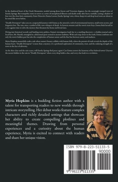 Deadly Downpour: A Eureka Springs Mystery by Myria Hopkins In the heart of the Ozark Mountains lies Eureka Springs, a picturesque town shrouded in mystery and Victorian charm. But beneath its scenic beauty, a deadly secret is about to unfold in Myria Hopkins' gripping novel, "Deadly Downpour." Detective Emma Larson, a native of Eureka Springs, finds herself embroiled in a perplexing case as a series of unexplained illnesses and deaths strike her beloved town following heavy rainfalls. With each drop of rain, fear and paranoia escalate among the townspeople, who suspect a lethal toxin hidden in the rainfall. As Emma delves deeper into the mystery, she confronts a web of small-town secrets, environmental enigmas, and historical puzzles. Her investigation leads her to a historic journal, revealing a long-forgotten tradition of "purifying rains," linked to a respected local figure and amateur historian, Mr. Harold. But what starts as a search for truth quickly spirals into a chilling discovery of delusion and danger. "Deadly Downpour" masterfully weaves elements of detective fiction, psychological thriller, and environmental mystery, set against the backdrop of Eureka Springs' stunning Victorian architecture and the natural peril of the Ozark Mountains. Hopkins explores the complex dynamics of family, community paranoia, and the haunting legacy of local lore. As the storm clouds gather, Emma races against time to unravel town's hidden secrets and confront the reality of nature's danger. Amidst the suspenseful narrative, the novel poignantly addresses themes of mental health awareness, the resilience of the human spirit, and the profound impact of interpersonal conflicts. Will Emma uncover the truth behind the mysterious deaths? Can she restore peace to a community fractured by mistrust and fear? "Deadly Downpour" is a compelling tale of mystery, resilience, and the enduring power of community healing. Join Detective Larson on her quest to unveil the truth in this weather-related mystery, where every clue leads to another twist, and every raindrop echoes the past's forgotten rituals. "Deadly Downpour" is a must-read for fans of intricate mysteries and deeply human stories.