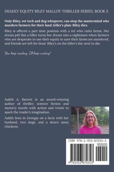 Only Riley, vet tech and dog whisperer, can stop the mastermind who murders farmers for their land; killer's plan: Riley dies. Riley is offered a part time position with a vet who visits farms. Her dream job! But a killer turns her dream into a nightmare when farmers who are desperate to use their equity to save their farms are murdered, and friends are left for dead. Riley's on the killer's list: next to die.