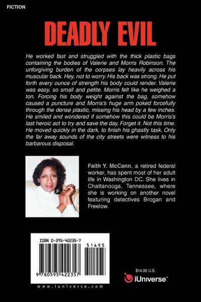 He worked fast and struggled with the thick plastic bags containing the bodies of Valerie and Morris Robinson. The unforgiving burden of the corpses lay heavily across his muscular back. Hey, not to worry. His back was strong. He put forth every ounce of strength his body could render. Valerie was easy, so small and petite. Morris felt like he weighed a ton. Forcing his body weight against the bag, somehow caused a puncture and Morris's huge arm poked forcefully through the dense plastic, missing his head by a few inches. He smiled and wondered if somehow this could be Morris' last heroic act to try and save the day. Forget it. Not this time. He moved quickly in the dark, to finish his ghastly task. Only the far away sounds of the city streets were witness to his barbarous disposal.