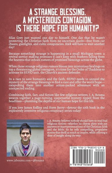 A Strange Blessing. A Mysterious Contagion. Is There Hope for Humanity? Silas Grey just wanted one day to himself. One day that he wasn't protecting the Christian faith from no uncertain doom-free from car chases, gunfights, and cultic conspiracies. R&R will have to wait another day! Because something strange is happening in a small Michigan town: a revival service making promises it can't keep with feathers falling from the heavens that echoes rumors of promised blessings across the globe. When those strange religious rumors bloom into mysterious healings on top a threatening global contagion, it's time for the Order of Thaddeus to activate its SEPIO unit, the Church's ancient defender. In a race to save humanity and the faith, SEPIO needs to unravel the mystery of the strange blessings to find a cure and offer the world hope-catapulting them into another action-packed adventure with an unexpected ending. Combining faith, fact, and fiction like few religious writers, J. A. Bouma weaves together a page-turning, suspenseful mystery ripped from the headlines-plumbing the depths of our human hope for this life. If you love James Rollins and Steve Berry-devour the 10th book in the explosively inventive religious conspiracy series today!