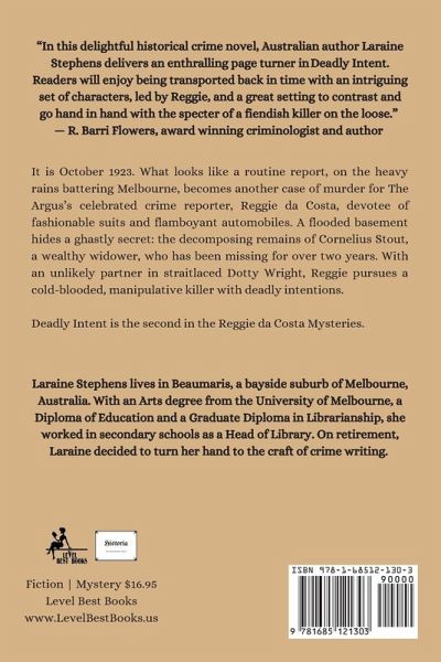 It is October 1923. What looks like a routine report, on the heavy rains battering Melbourne, becomes another case of murder for The Argus's celebrated crime reporter, Reggie da Costa, devotee of fashionable suits and flamboyant automobiles. A flooded basement hides a ghastly secret: the decomposing remains of Cornelius Stout, a wealthy widower, who has been missing for over two years. With an unlikely partner in straitlaced Dotty Wright, Reggie pursues a cold-blooded, manipulative killer with deadly intentions. Deadly Intent is the second in the Reggie da Costa Mysteries.