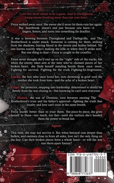 Love was never meant to be a game. And in Daringhood, losing means breaking more than just your heart. Freya walked away once. She swore she'd never let them ruin her again. But heartbreak doesn't end just because you leave-it lingers, festers, and turns into something far deadlier. A war is brewing between Daringhood and Daringville, and The Brotherhood is under attack. Someone is coming for them, striking from the shadows, leaving blood in the streets and bodies behind. No one knows exactly who's making the kills or when they'll strike next. But one thing is clear-Freya is caught in the crossfire. Freya never thought she'd end up on the "right" side of the tracks, but when the enemy takes aim at the men who've claimed pieces of her broken heart, she finds herself standing beside them once more. Fighting for survival. Fighting for the truth. Fighting for forgiveness. Lucas, the boy who once loved her, now drowning in grief over the mother she took from him-and the ache of a broken heart. Gage, the protector, stepping into leadership, determined to shield his family from the war closing in-but knowing he can't save everyone. Hazen, the son of Dominic, torn between earning The Brotherhood's trust and his father's approval-fighting the truth that loyalty and love can't exist in the same breath. Freya knows better than to trust them. But piece by piece, she gives herself to them-too much, too fast-until she realizes she's handed them the power to break her. Again. This time, she may not survive it. But when betrayal cuts deeper than bullets, and enemies close in from all sides, love isn't the only thing on the line. Can their broken pieces form a whole heart-or will the war tear them apart forever?