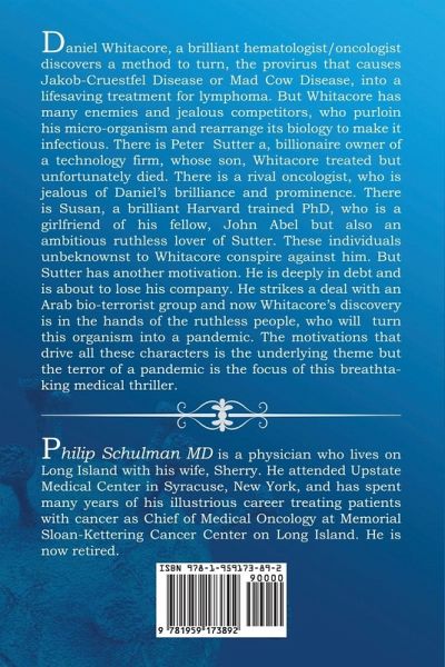 Daniel Whitacore, a brilliant hematologist/oncologist discovers a method töturn, the provirus that causes Jakob-Cruestfel Disease or Mad Cow Disease,¿into a lifesaving treatment for lymphoma. But Whitacore has many enemies and¿jealous competitors, who purloin his micro-organism and rearrange its biology¿to make it infectious. There is Peter¿¿Sutter a, billionaire owner of a technology¿ firm, whose son, Whitacore treated but unfortunately died. There is a rival oncologist,¿who is jealous of Daniel's brilliance and prominence. There is Susan, a brilliant Harvard-trained Ph.D., who is ägirlfriend of his fellow, John Abel but also an¿ambitious ruthless lover of Sutter. These individuals¿unbeknownst to Whitacore conspire against him. But Sutter has another motivation.¿He is deeply in debt and is about to lose his company. He strikes a deal with an Arab¿bio-terrorist group and now Whitacore's discovery is in the hands of the ruthless people,¿who will¿¿turn this organism into a pandemic. The motivations that drive all these characters is the underlying theme but the terror of a pandemic is the focus of this breathtaking medical thriller.