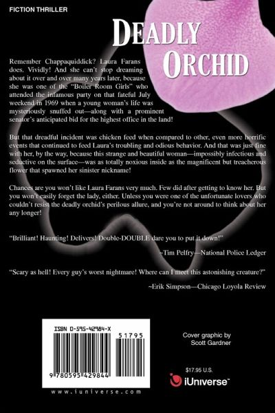 Remember Chappaquiddick? Laura Farans does. Vividly! And she can't stop dreaming about it over and over many years later, because she was one of the "Boiler Room Girls" who attended the infamous party on that fateful July weekend in 1969 when a young woman's life was mysteriously snuffed out-along with a prominent senator's anticipated bid for the highest office in the land! But that dreadful incident was chicken feed when compared to other, even more horrific events that continued to feed Laura's troubling and odious behavior. And that was just fine with her, by the way, because this strange and beautiful woman-impossibly infectious and seductive on the surface-was as totally noxious inside as the magnificent but treacherous flower that spawned her sinister nickname! Chances are you won't like Laura Farans very much. Few did after getting to know her. But you won't easily forget the lady, either. Unless you were one of the unfortunate lovers who couldn't resist the deadly orchid's perilous allure, and you're not around to think about her any longer! "Brilliant! Haunting! Delivers! Double-DOUBLE dare you to put it down!" ~Tim Pelfry-National Police Ledger "Scary as hell! Every guy's worst nightmare! Where can I meet this astonishing creature?" ~Erik Simpson-Chicago Loyola Review