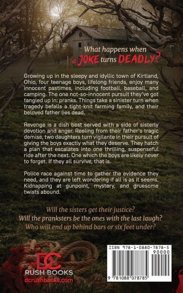 What happens when a joke turns deadly? Growing up in the sleepy and idyllic town of Kirtland, Ohio, four teenage boys, lifelong friends, enjoy many innocent pastimes, including football, baseball, and camping. The one not-so-innocent pursuit they've got tangled up in: pranks. Things take a sinister turn when tragedy befalls a tight-knit farming family, and their beloved father lies dead. Revenge is a dish best served with a side of sisterly devotion and anger. Reeling from their father's tragic demise, two daughters turn vigilante in their pursuit of giving the boys exactly what they deserve. They hatch a plan that escalates into one thrilling, suspenseful ride after the next. One which the boys are likely never to forget. If they all survive, that is. Police race against time to gather the evidence they need, and they are left wondering if all is as it seems. Kidnapping at gunpoint, mystery, and gruesome twists abound. Will the sisters get their justice? Will the pranksters be the ones with the last laugh? Who will end up behind bars or six feet under?