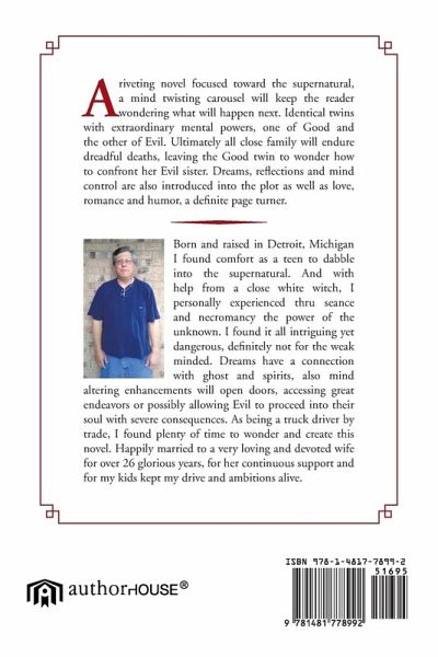 A riveting novel focused toward the supernatural, a mind twisting carousel will keep the reader wondering what will happen next. Identical twins with extraordinary mental powers, one of Good and the other of Evil. Ultimately all close family will endure dreadful deaths, leaving the Good twin to wonder how to confront her Evil sister. Dreams, reflections and mind control are also introduced into the plot as well as love, romance and humor, a definite page turner. Born and raised in Detroit, Michigan I found comfort as a teen to dabble into the supernatural. And with help from a close white witch, I personally experienced thru seance and necromancy the power of the unknown. I found it all intriguing yet dangerous, definitely not for the weak minded. Dreams have a connection with ghost and spirits, also mind altering enhancements will open doors, accessing great endeavors or possibly allowing Evil to proceed into their soul with severe consequences. As being a truck driver by trade, I found plenty of time to wonder and create this novel. Happily married to a very loving and devoted wife for over 26 glorious years, for her continuous support and for my kids kept my drive and ambitions alive.