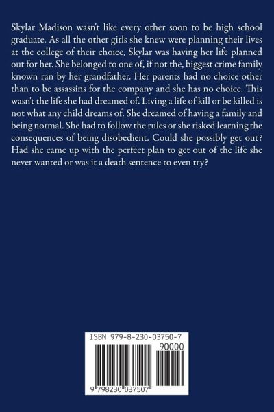 Skylar Madison wasn't like every other soon to be high school graduate. As all the other girls she knew were planning their lives at the college of their choice, Skylar was having her life planned out for her. She belonged to one of, if not the, biggest crime family known ran by her grandfather. Her parents had no choice other than to be assassins for the company and she has no choice. This wasn't the life she had dreamed of. Living a life of kill or be killed is not what any child dreams of. She dreamed of having a family and being normal. She had to follow the rules or she risked learning the consequences of being disobedient. Could she possibly get out? Had she came up with the perfect plan to get out of the life she never wanted or was it a death sentence to even try?