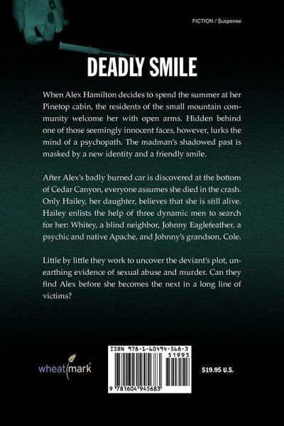 When Alex Hamilton decides to spend the summer at her Pinetop cabin, the residents of the small mountain community welcome her with open arms. Hidden behind one of those seemingly innocent faces, however, lurks the mind of a psychopath. The madman's shadowed past is masked by a new identity and a friendly smile. After Alex's badly burned car is discovered at the bottom of Cedar Canyon, everyone assumes she died in the crash. Only Hailey, her daughter, believes that she is still alive. Hailey enlists the help of three dynamic men to search for her: Whitey, a blind neighbor, Johnny Eaglefeather, a psychic and native Apache, and Johnny's grandson, Cole. Little by little they work to uncover the deviant's plot, unearthing evidence of sexual abuse and murder. Can they find Alex before she becomes the next in a long line of victims?
