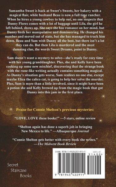 USA Today bestselling author Connie Shelton introduces her newest Samantha Sweet cozy mystery. With nearly 2 million books sold and downloaded in more than 110 countries, find out what the fuss is all about! Samantha Sweet is back at Sweet's Sweets, her bakery with a magical flair, while husband Beau is now a full time rancher. When he hires a young cowboy to help out, no one suspects that Danny Flores comes with a lot of baggage until Lila, the girl he left behind, shows up. She says she has romance on her mind, but Danny finds her manipulative and domineering. He changed his number and moved out of state, but she has managed to track him down. Beau and Sam wish Danny all the best, but there isn't a lot they can do. But then Lila is murdered and the most damning clue, the words Sweet Dreams, point to Danny. Sam doesn't want a mystery to solve-she's ready for cozy time with her young granddaughter. Plus, she and Kelly have been cooking up some new mischief, discovering that the strange book with the rune-like writing actually contains something magical. As Danny's situation gets worse, Sam realizes no one else, except maybe Eliza the calico cat, is going to help her solve the murder. Plus, Sam is more than a little involved, since it might have been a potion she and Kelly brewed up from the magic book that got Danny into this jam in the first place. Readers are raving about these lighthearted, relaxing, well-written books-Samantha may not be young, beautiful or have the perfect body, but she is intelligent, independent, and hard working, the kind of person you feel you already know.