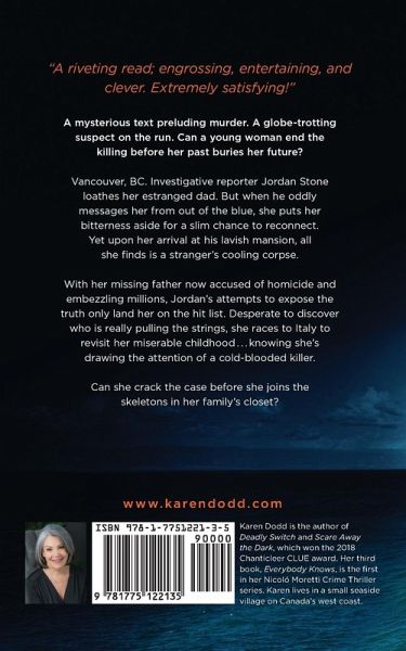 A mysterious text preluding murder. A globe-trotting suspect on the run. Can a young woman end the killing before her past buries her future? Vancouver, BC. Investigative reporter Jordan Stone loathes her estranged dad. But when he oddly messages her from out of the blue, she puts her bitterness aside for a slim chance to reconnect. Yet upon her arrival at his lavish mansion, all she finds is a stranger's cooling corpse. With her missing father now accused of homicide and embezzling millions, Jordan's attempts to expose the truth only land her on the hit list. Desperate to discover who is really pulling the strings, she races to Italy to revisit her miserable childhood... knowing she's drawing the attention of a cold-blooded killer. ¿¿Can she crack the case before she joins the skeletons in her family's closet?