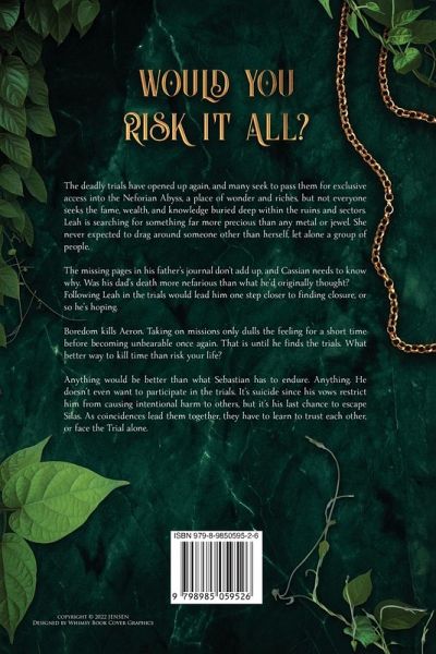 The deadly trials have opened up again, and many seek to pass them for exclusive access into the Neforian Abyss, a place of wonder and riches, but not everyone seeks the fame, wealth, and knowledge buried deep within the ruins and sectors. Leah is searching for something far more precious than any metal or jewel. She never expected to drag around someone other than herself, let alone a group of people. The missing pages in his father's journal don't add up, and Cassian needs to know why. Was his dad's death more nefarious than what he'd originally thought? Following Leah in the trials would lead him one step closer to finding closure, or so he's hoping. Boredom kills Aeron. Taking on missions only dulls the feeling for a short time before becoming unbearable once again. That is until he finds the trials. What better way to kill time than risk your life? Anything would be better than what Sebastian has to endure. Anything. He doesn't even want to participate in the trials. It's suicide since his vows restrict him from causing intentional harm to others, but it's his last chance to escape Silas. As coincidences lead them together, they have to learn to trust each other, or face the Trial alone.