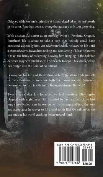Gripped with fear and confusion as his paralegal takes her last breath in his arms, Jonathan vows to avenge her savage death ... or die trying. With a successful career as an attorney living in Portland, Oregon, Jonathan's life is about to take a turn that nobody could have predicted, especially him. An adventure seeker, he loves his life until a chain of events leaves him reeling and wondering if life as he knows it is on the brink of collapsing. Leaving him hanging in the balance between mayhem and bliss, will he be able to regain his sanity before he's hurled into the point of no return? Fearing for his life and those close to him, Jonathan finds himself in the crosshairs of someone with their own agenda. Someone determined to turn his life into a living nightmare. But why? Twenty years after Just Jonathan, we find Jonathan Elliott again plagued with nightmares. Still haunted by his past, which he had long since buried, can he overcome his demons and find the love and acceptance he craves to fill a void in his life? Or will he be too late and see his world crashing down around him?
