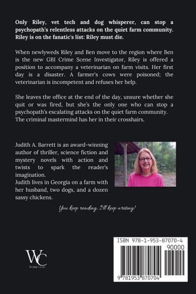 Only Riley, vet tech and dog whisperer, can stop the attacks on the rural community. Riley is on the killer's list: Riley must die. When newlyweds Riley and Ben move to the region where Ben is the new GBI Crime Scene Investigator, Riley is offered a position to accompany a veterinarian on farm visits. Her first day is a disaster. A farmer's cows were poisoned; the veterinarian is incompetent and refuses her help. She leaves the office at the end of the day, unsure whether she quit or was fired, but she's the only one who can stop a psychopath's obsessive attacks on the quiet farm community. The criminal mastermind has her in their crosshairs.