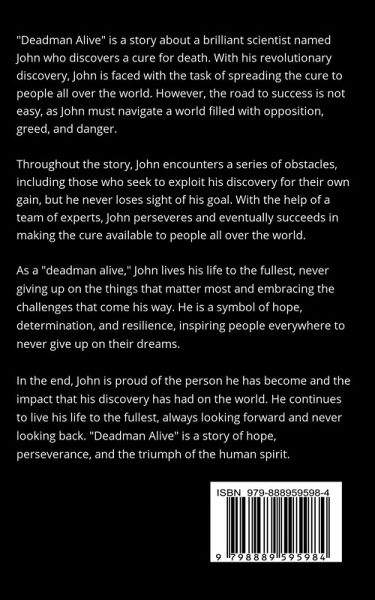 ""Deadman Alive"" is a story about a brilliant scientist named John who discovers a cure for death. With his revolutionary discovery, John is faced with the task of spreading the cure to people all over the world. However, the road to success is not easy, as John must navigate a world filled with opposition, greed, and danger. Throughout the story, John encounters a series of obstacles, including those who seek to exploit his discovery for their own gain, but he never loses sight of his goal. With the help of a team of experts, John perseveres and eventually succeeds in making the cure available to people all over the world. As a ""deadman alive,"" John lives his life to the fullest, never giving up on the things that matter most and embracing the challenges that come his way. He is a symbol of hope, determination, and resilience, inspiring people everywhere to never give up on their dreams. In the end, John is proud of the person he has become and the impact that his discovery has had on the world. He continues to live his life to the fullest, always looking forward and never looking back. ""Deadman Alive"" is a story of hope, perseverance, and the triumph of the human spirit.