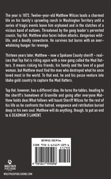 The year is 1872. Twelve-year-old Matthew Wilcox leads a charmed life on his family's sprawling ranch in Washington Territory until a series of tragic events leave him orphaned and in the clutches of a vicious band of outlaws. Threatened by the gang leader's perverted cousin, Top Hat, Matthew also faces Indian attacks, dangerous wildlife, and a deadly snowstorm. He survives but burns with an overwhelming hunger for revenge. Thirteen years later, Matthew - now a Spokane County sheriff - realizes that Top Hat is riding again with a new gang called the Mad Hatters. It means risking his friends, his family and the love of a good woman, but Matthew must find the man who destroyed what he once loved most in the world. To that end, he and his posse venture into Idaho gold country to capture the Mad Hatters. Top Hat, however, has a different idea. He turns the tables, heading to the sheriff's hometown of Granville and going after everyone Matthew holds dear. What follows will haunt Sheriff Wilcox for the rest of his life as he confronts the hatred, vengeance and retribution buried deep in his own soul. Matthew will do anything, though, to put an end to A DEADMAN'S LAMENT.