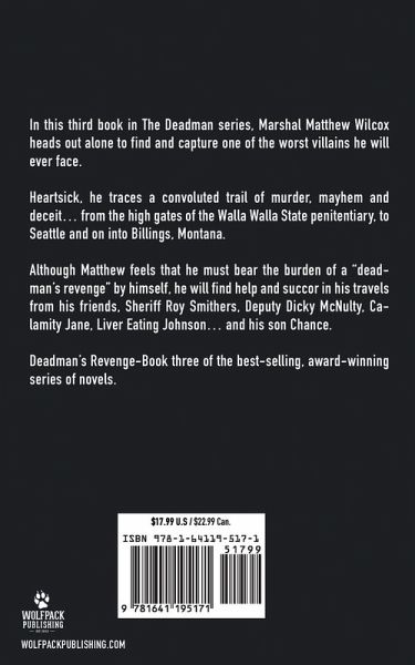 In this third book in the Dead Man series, Marshal Matthew Wilcox heads out alone to find and capture one of the worst villains he will ever face. Heartsick, he traces a convoluted trail of murder, mayhem and deceit… from the high gates of the Walla Walla State penitentiary, to Seattle and on into Billings, Montana. Although Matthew feels that he must bear the burden of a "deadman's revenge" by himself, he will find help and succor in his travels from his friends, Sheriff Roy Smithers, Deputy Dicky McNulty, Calamity Jane, Liver Eating Johnson… and his son Chance. Deadman's Revenge- Book three of the best-selling, award-winning series of novels, Deadman's Fury and Deadman's Lament