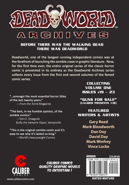 With over 100 issues released and 1,000,000 copies sold Deadworld arrived on the zombie apocalypse scene well before The Walking Dead and presents a different and unique take on the global nightmare. This Book Five Archive edition collects issues 19-23 of the first volume of Deadworld. Also included, the original tale of "Deadworld: Guns for Sale", from Caliber Presents #8. As Dan and Joey depart the community they were staying with, a band of survivors in Michigan decide to head to the wilds of the Upper Peninsula, hoping that the cold weather and sparse population will inhibit the menace of the walking dead. Lead by John this ragtag group races for the remote area, hoping they can establish their own civilization. Meanwhile King Zombie continues his quest to find these humans and put an end to their meddling as he seeks to fully take over the world under his dominion, backed by his ever growing zombie horde. A must for any zombie horror fan!
