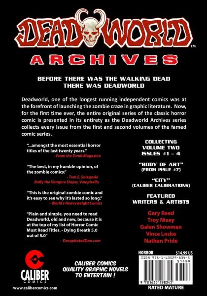 Before there was The Walking Dead there was Deadworld. First published in the 1986, Deadworld is one of indie comics longest running horror series with over 100 issues and graphic novels in released and over 1,000,000 copies sold. While being considered the 'godfather' of all the zombie apocalyptic comics that followed. Here are the beginnings of Volume Two and Book Seven has the first four issues. Time has moved ahead and the plan for sanctuary in the frozen north hasn't worked out as planned. The entity of Amy is trapped but hoping to unleash herself as the remaining teens find themselves in a renegade group, unaware that Moloch has retaken the city...a city that the zombies also want. Also included is the short story "Body Art" featuring the character, Tattoo and a short piece entitled "The City" which appeared in the pages of Calibrations. Deadworld Archives series collects all of the original Deadworld comics originally released by Arrow and Caliber Comics.