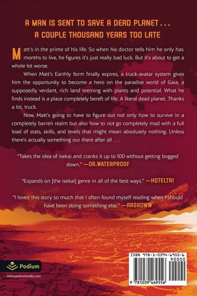 In this isekai from the author of How to Survive at the End of the World, a man is sent to save a dead planet . . . a couple thousand years too late. Matt's in the prime of his life. So when his doctor tells him he only has months to live, he figures it's just really bad luck. But it's about to get a whole lot worse. When Matt's Earthly form finally expires, a truck-avatar system gives him the opportunity to become a hero on the paradise world of Gaia, a supposedly verdant, rich land teeming with plants and potential. What he finds instead is a place completely bereft of life. A literal dead planet. Thanks a lot, truck. Now, Matt's going to have to figure out not only how to survive in a completely barren realm but also how to not go completely mad with a full load of stats, skills, and levels that might mean absolutely nothing. Unless there's actually something out there after all . . . The first volume of the hit LitRPG fantasy series-with almost two million views on Royal Road-now available on Kindle, Kindle Unlimited, and Audible! "Takes the idea of isekai and cranks it up to 100 without getting bogged down." -Dr.Waterproof "Expands on [the isekai] genre in all of the best ways." -Hotelta1