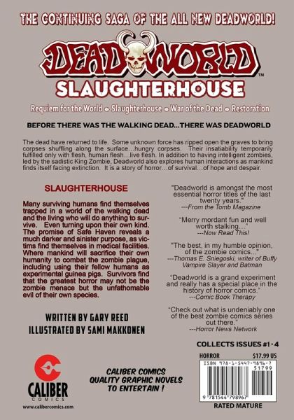 Welcome to the Deadworld! Long before there was The Walking Dead, there was Deadworld. Considered by many to be the godfather of the original zombie comic with over 100 issues and graphic novels in print and over 1,000,000 copies sold, Deadworld ripped into the undead with intelligent zombies on a mission and a group of poor teens riding in a school bus desperately try to stay one step ahead of the sadistic, Harley-riding King Zombie. Death, mayhem, and a touch of supernatural evil made Deadworld a classic and now here's your chance to get into the story! In this self-contained story arc, many humans find themselves trapped in a world of the walking dead and the living who will do anything to survive. The promise of Safe Haven reveals a much darker and sinister purpose, when victims find themselves in a medical facility which will stop at nothing to combat the zombie plague. In an effort to solve the growing plague, researchers try a scientific approach to save mankind - humans as guinea pigs! Natural diseases such as leprosy, AIDS, and cancer are used to infect the zombies. Survivors find that the greatest horror may not be the zombies but other humans. To the unfortunate, Safe Haven becomes known as the Slaughterhouse. Note that although Slaughterhouse is meant to stand on is own, it follows the story "Deadworld: Requiem for the World" and precedes "Deadworld: War of the Dead". Collects Deadworld Slaughterhouse comic issues 1-4.