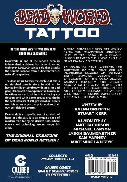 Before there was THE WALKING DEAD there was DEADWORLD. Deadworld is one of the longest running independent, acclaimed horror comic series, with over 1,000,000 copies sold that attacks the zombie menace from a different 'supernatural' perspective. The dead return to walk the earth...but this is no standard zombie story. In addition to having intelligent zombies with a mission and goal, Deadworld also explores the human interactions as mankind finds itself facing extinction. And while some groups organize in the best interests of self- preservation, others use this as an opportunity to explore their own self-deluded dreams. Deadworld is a story of horror...of survival...of hope and despair. It is an ongoing saga of modern man facing his darkest side...where science and technology are no longer his allies. With Deadworld: Tattoo - The original creators of Deadworld return! Ralph Griffith and Stuart Kerr deliver a self-contained spin-off story from the Deadworld universe. Here is the saga of a female hybrid between the living and the dead known as Tattoo. In order to piece together the answers to why there are an increasing number of "intelligent" zombies leading the onslaught of the dead armies against humanity, the zombie slayer Tattoo must travel into the depths of zombie hell in the city of New Orleans. There she will find the ruling warlord of the dead... The Rasta Man. Illustrated by Jake Jacobson, Mike Larson, Jason Baumgartner, Sam Varney, Mike Mikolajczyk, Mariousz, and Patryk Cabala. Collects comic issues 1-4.