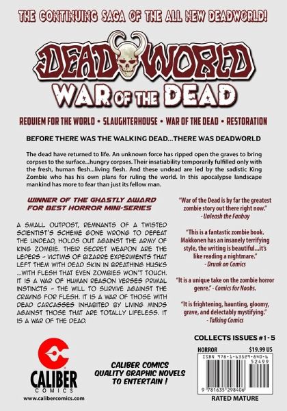 For the first time Deadworld in full color! Before there was The Walking Dead there was Deadworld. Considered by many to be the godfather of the original zombie comic with over 100 issues and graphic novels in print and over 1,000,000 copies sold, Deadworld ripped into the undead with intelligent zombies on a mission and a group of poor teens riding in a school bus desperately try to stay one step ahead of the sadistic, Harley-riding King Zombie. Designed to stand on its own, the story line picks up the pieces of Deadworld: Slaughterhouse as it returns to the sanctuary known as Safe Haven. A small outpost, remnants of a twisted scientist's scheme gone wrong to defeat the plague, holds out against the army of King Zombie. Their secret weapon are the Lepers - victims of a bizarre experiment that left them with dead skin in breathing husks...with flesh that even zombies won't touch. It is a war of intelligence versus primal instincts - the will to survive against the craving for flesh. It is a war of those with dead carcasses inhabited by living minds against those that are totally lifeless. It is a War of the Dead. Collects Deadworld: War of the Dead comic series issues #1-5.