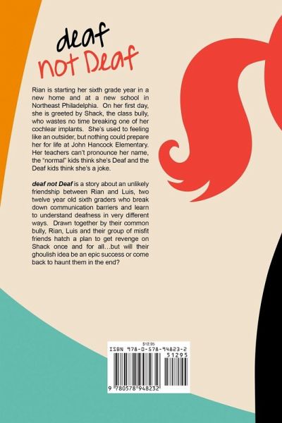 Rian is starting her sixth grade year in a new home and at a new school in Northeast Philadelphia. On her first day, she is greeted by Shack, the class bully, who wastes no time breaking one of her cochlear implants. She's used to feeling like an outsider, but nothing could prepare her for life at John Hancock Elementary. Her teachers can't pronounce her name, the "normal" kids think she's Deaf and the Deaf kids think she's a joke, especially Luis Rodriguez, a Deaf boy who uses American Sign Language to communicate with his small circle of family and friends. deaf not Deaf is a story about an unlikely friendship between Rian and Luis, two sixth graders who understand deafness in very different ways. Drawn together by a common enemy, Rian, Luis and their small group of misfit friends hatch a ghoulish plan to get revenge on Shack once and for all...but will their idea be an epic success or will playing with the supernatural come back to haunt them in the end?