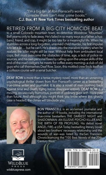"Ron Franscell's 'Deaf Row' tells a darkly engrossing story with masterful, easy-flowingprose and a cleverinfusion of humor. The tension builds incrementally to a chilling five-star climax in which Franscellputshis well-honed skill as a true crime author to gooduse. It gave me goosebumps big time." -ANNE HILLERMAN, bestselling author of the Leaphorn, Chee, Manuelito mysteries Retired from a big-city homicide beat to a small Colorado mountain town, ex-detective Woodrow "Mountain" Bell yearns only to fade away. He's failed in so many ways as a father, a husband, friend, and cop that it might be too late for a meaningful life. When he stumbles across a long-forgotten, unsolved child murder, his first impulse is to let it lie ... but he can't. He's drawn into the macabre mystery when he realizes the killer might still be near. Without help from ambivalent local cops, Bell must overcome the obstacles of time, age, and a lack of police resources by calling upon the unique skills of the end-of-the-road codgers he meets for coffee every morning-a club of old guys who call themselves Deaf Row. Soon, this motley crew finds itself on a collision course with a serial butcher. "...an undisputed gift for storytelling." -GREGG OLSEN, #1 New York Times bestselling author of IF YOU TELL DEAF ROW is more than a tense mystery novel, more than an unnerving psychological thriller drawn from Ron Franscell's career as a bestselling true-crime writer and journalist. It is also a novel of men pushing back against time and death, trying not to disappear entirely. DEAF ROW is a moving, occasionally humorous, portrait of flawed people caught in a web of pain and regret. And although you might think you know where this ghastly case is headed, the climax will blindside you.