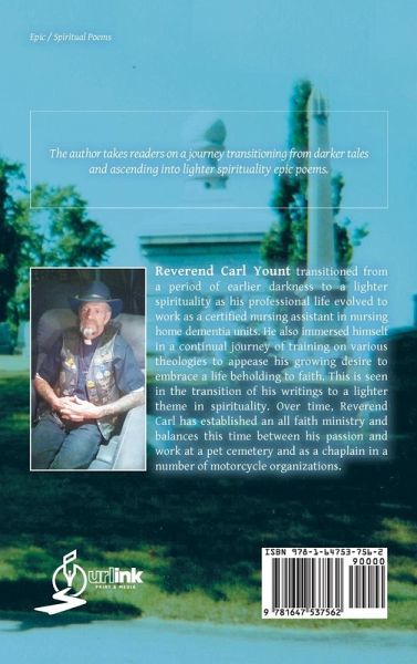 The author takes readers on a journey transitioning from darker tales and ascending into lighter spirituality epic poems. Reverend Carl Yount transitioned from a period of earlier darkness to a lighter spirituality as his professional life evolved to work as a certified nursing assistant in nursing home dementia units. He also immersed himself in a continual journey of training on various theologies to appease his growing desire to embrace a life beholding to faith. This is seen in the transition of his writings to a lighter theme in spirituality. Over time, Reverend Carl has established an all faith ministry and balances this time between his passion and work at a pet cemetery and as a chaplain in a number of motorcycle organizations.