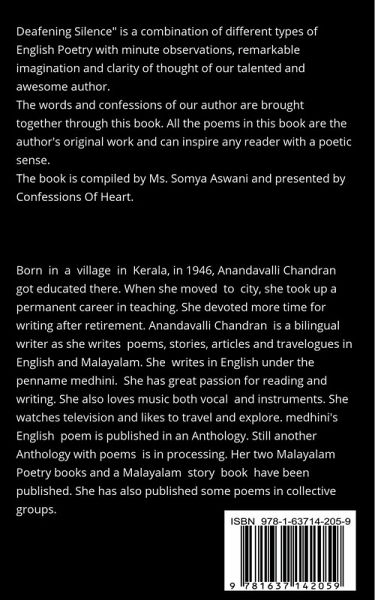 Deafening Silence Collected Poems (Vol. 1) ""Deafening Silence"" is a combination of different types of English Poetry with minute observations, remarkable imagination and clarity of thought of our talented and awesome author. The words and confessions of our author are brought together through this book. All the poems in this book are the author's original work and can inspire any reader with a poetic sense. The book is compiled by Ms. Somya Aswani and presented by Confessions Of Heart.