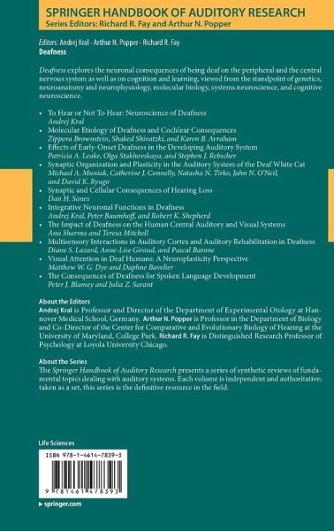1. To Hear or Not To Hear: Neuroscience of Deafness Andrej Kral.- 2. Molecular Etiology of Deafness and Cochlear Consequences Zippora Brownstein, Shaked Shivatzki, and Karen B. Avraham.- 3. Effects of Early-Onset Deafness in the Developing Auditory System Patricia A. Leake, Olga Stakhovskaya, and Stephen J. Rebscher.- 4. Synaptic Organization and Plasticity in the Auditory System of the Deaf White Cat Michael A. Muniak, Catherine J. Connelly, Natasha N. Tirko, Jahn N. O'Neil, and David K. Ryugo.- 5. Synaptic and Cellular Consequences of Hearing Loss Dan H. Sanes.- 6. Integrative Neuronal Functions in Deafness Andrej Kral, Peter Baumhoff, and Robert K. Shepherd.- 7. The Impact of Deafness on the Human Central Auditory and Visual SystemsAnu Sharma and Teresa Mitchell.- 8. Multisensory Interactions in Auditory cortex and Auditory Rehabilitation in Deafness Diane S Lazard, Anne-Lise Giraud, and Pascal Barone.- 9. Visual Attention in Deaf Humans: A Neuroplasticity Perspective Matthew W. G. Dye and Daphne Bavelier.- 10. The Consequences of Deafness for Spoken Language Development Peter J. Blamey and Julia Z. Sarant.