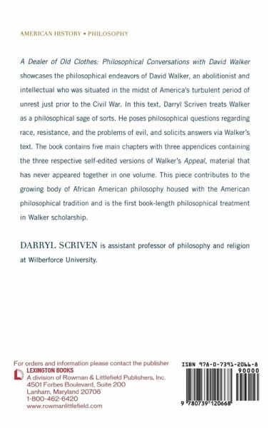 A Dealer of Old Clothes treats David Walker, an early nineteenth-century abolitionist, as a philosophical sage. In this text, Scriven poses philosophical questions to Walker via his Appeal and solicits philosophical answers on topics such as race, emancipatory struggle, and the problem of evil.