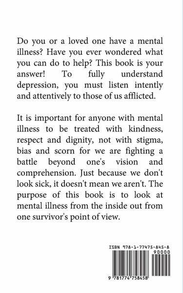 Do you or a loved one have a mental illness? Have you ever wondered what you can do to help? This book is your answer! To fully understand depression, you must listen intently and attentively to those of us afflicted. It is important for anyone with mental illness to be treated with kindness, respect and dignity, not with stigma, bias and scorn for we are fighting a battle beyond one's vision and comprehension. Just because we don't look sick, it doesn't mean we aren't. The purpose of this book is to look at mental illness from the inside out from one survivor's point of view.
