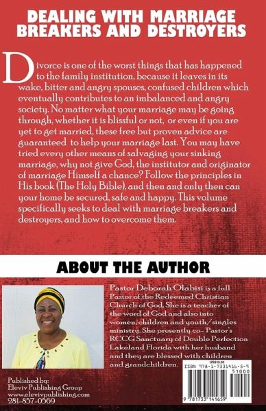 Divorce is one of the worst things that has happened to the family institution, because it leaves in its wake, bitter and angry spouses, confused children which eventually contributes to an imbalanced and angry society. No matter what your marriage may be going through, whether it is blissful or not, or even if you are yet to get married, these free but proven advice are guaranteed to help your marriage last. You may have tried every other means of salvaging your sinking marriage, why not give God, the institutor and originator of marriage Himself a chance? Follow the principles in His book (The Holy Bible), and then and only then can your home be secured, safe and happy. This volume specifically seeks to deal with marriage breakers and destroyers, and how to overcome them.