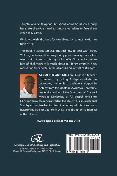 Temptations or tempting situations come to us on a daily basis. We therefore need to prepare ourselves to face them when they come. While we wish the best for ourselves, we cannot avoid the trials of life. This book is about temptations and how to deal with them. Yielding to temptations may bring grave consequences, but overcoming them also brings its benefits. Our conduct in the face of challenges tells much about our inner strength. Also, recovering from defeat after falling is a major test of strength. About the Author: Femi Olisa is a teacher of the word by calling. A Nigerian of Yoruba extraction, he holds a bachelor's degree in botany from the Obafemi Awolowo University, Ile-Ife. A member of the Mountain of Fire and Miracles Ministries, a full-gospel end-time Christian army church, his work in the church as a minister and Sunday school teacher inspired the writing of this book. He is happily married to Catherine Olisa, and the union is blessed with children.