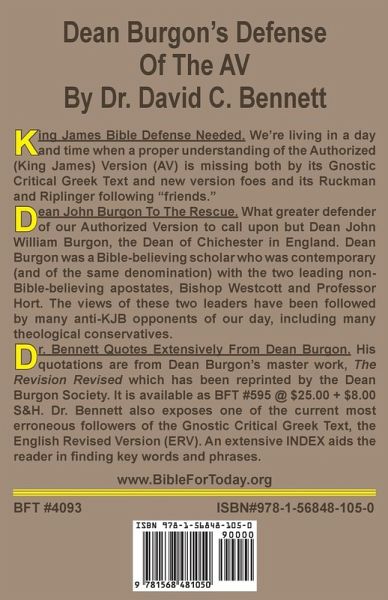 We're living in a day and time when a proper understanding of the Authorized (King James) Version (AV) is missing. What greater defender of our Authorized Version to call upon but Dean John William Burgon, the Dean of Chichester in England. Dean Burgon was a Bible-believing scholar who was contemporary (and of the same denomination) with the two leading non-Bible-believing apostates, Bishop Westcott and Professor Hort. The views of these two leaders have been followed by many anti-KJB opponents of our day, including many theological conservatives. Dr. Bennett's quotations are presented in the work and are from Dean Burgon's master work, The Revision Revised which has been reprinted by the Dean Burgon Society.