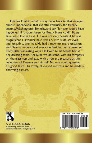 Deanna Durbin would always look back to that strange, almost unbelievable, that eventful February the twenty-second, Washington's Birthday, and say, "It never would have happened if it hadn't been for Buzzy Blue's cold!" Buzzy Blue was Deanna's cat . He was not only beautiful, he was magnificent, a lavender blue Persian, with wide-set eyes and long, fine, even hair. He had a mew for every occasion, and Deanna understood everyone. Besides, he had ever so many little fascinating ways. He loved to sit beside her at her dressing table. Really, he would stand, with his forepaws on the glass top, and gaze with pride and pleasure at the reflection of Deanna and himself. No one could question his good taste. His lovely, blue-eyed mistress and he made a charming picture.