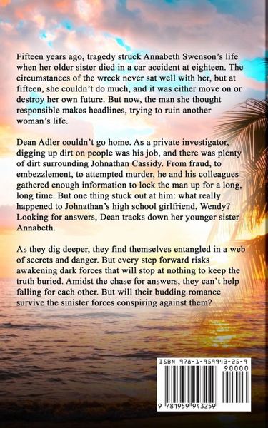 Fifteen years ago, tragedy struck Annabeth Swenson's life when her older sister died in a car accident at eighteen. The circumstances of the wreck never sat well with her, but at fifteen, she couldn't do much, and it was either move on or destroy her own future. But now, the man she thought responsible makes headlines, trying to ruin another woman's life. Dean Adler couldn't go home. As a private investigator, digging up dirt on people was his job, and there was plenty of dirt surrounding Johnathan Cassidy. From fraud, to embezzlement, to attempted murder, he and his colleagues gathered enough information to lock the man up for a long, long time. But one thing stuck out at him: what really happened to Johnathan's high school girlfriend, Wendy? Looking for answers, Dean tracks down her younger sister Annabeth. As they dig deeper, they find themselves entangled in a web of secrets and danger. But every step forward risks awakening dark forces that will stop at nothing to keep the truth buried. Amidst the chase for answers, they can't help falling for each other. But will their budding romance survive the sinister forces conspiring against them?