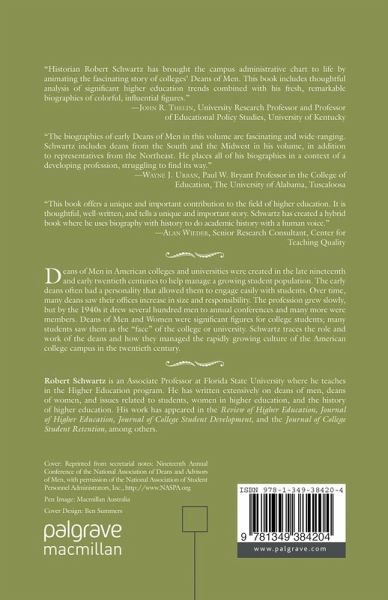Deans of men in American colleges and universities were created in the late nineteenth and early twentieth centuries to help manage a growing student population. The early deans often had a personality that allowed them to engage easily with students. Over time, many deans saw their offices increase in size and responsibility. The profession grew slowly but by the 1940's drew several hundred men to annual conferences and many more were members. Deans of men and women were significant figures for college students; many students saw them as the "face" of the college or university. Schwartz…mehr