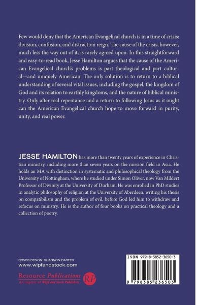 Few would deny that the American Evangelical church is in a time of crisis; division, confusion, and distraction reign. The cause of the crisis, however, much less the way out of it, is rarely agreed upon. In this straightforward and easy-to-read book, Jesse Hamilton argues that the cause of the American Evangelical church's problems is part theological and part cultural--and uniquely American. The only solution is to return to a biblical understanding of several vital issues, including the gospel, the kingdom of God and its relation to earthly kingdoms, and the nature of biblical ministry. Only after real repentance and a return to following Jesus as it ought can the American Evangelical church hope to move forward in purity, unity, and real power.