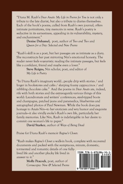 Diana M. Raab's Dear Anaïs: My Life in Poems for You is not only a tribute to the late diarist, but also a tribute to diaries themselves. Each of the book's poems, culled from Raab's own journal, offers intimate portraitures, tiny memoirs in verse. Raab's poetry is seductive in its earnestness, appealing in its vulnerability, mystery, and enchantment. Denise Duhamel, poet, author of Two and Two and Queen for a Day: Selected and New Poems Raab's skill is as a poet, but her passages are as intimate as a diary. She reconstructs her past mirroring Nin's emotional honesty. The reader never feels voyeuristic reading the intimate passages, but feels like a confidant, friend and maybe even a lover. Steve Reigns, Nin scholar, poet, and editor of My Life is Poetry In Diana Raab's "imaginary world.people drip with stories / and linger in bookstores and cafés / slurping foamy cappuccinos / and nibbling chocolate cake." And the poems in Dear Anaïs are, indeed, rife with both stories and the extravagantly various things of this world: Laundromats and writers' conferences, steel-tipped boots and champagne, patched jeans and paramedics, blueberries and autographed photos of Paul Newman. While the book does pay homage to Anaïs Nin-to her eroticism and wry humor and exquisite journals-it also vividly evoke's Raab's own life, particularly her family memories. Like Nin, Raab is indefatigable in her desire to commit one woman's life to paper. David Starkey, author of Ways of Being Dead Praise for Diana Raab's memoir Regina's Closet: " Raab makes Regina's Closet a walk-in book, complete with recovered documents and packed with the sumptuous, minute, domestic, tormented and romantic details of one fully-lived life and another plucky life lived in answer to it." Molly Peacock, poet, author of Cornucopia: New & Selected Poems