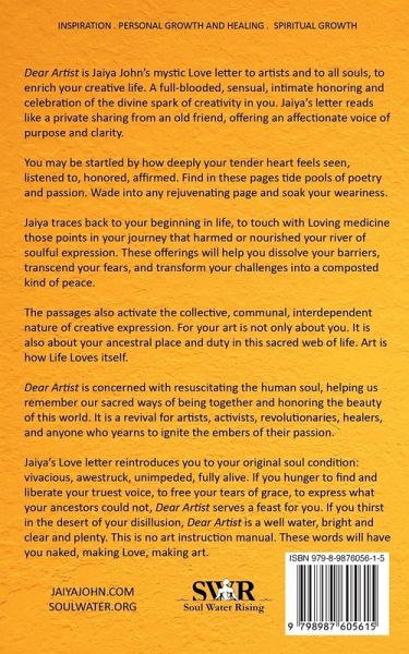 Dear Artist is Jaiya John's mystic Love letter to artists and to all souls, to enrich your creative life. A full-blooded, sensual, intimate honoring and celebration of the divine spark of creativity in you. Jaiya's letter reads like a private sharing from an old friend, offering an affectionate voice of purpose and clarity. You may be startled by how deeply your tender heart feels seen, listened to, honored, affirmed. Find in these pages tide pools of poetry and passion. Wade into any rejuvenating page and soak your weariness. Jaiya traces back to your beginning in life, to touch with Loving medicine those points in your journey that harmed or nourished your river of soulful expression. These offerings will help you dissolve your barriers, transcend your fears, and transform your challenges into a composted kind of peace. The passages also activate the collective, communal, interdependent nature of creative expression. For your art is not only about you. It is also about your ancestral place and duty in this sacred web of life. Art is how Life Loves itself. Dear Artist is concerned with resuscitating the human soul, helping us remember our sacred ways of being together and honoring the beauty of this world. It is a revival for artists, activists, revolutionaries, healers, students, teachers, and anyone who yearns to ignite the embers of their passion. Jaiya's Love letter reintroduces you to your original soul condition: vivacious, awestruck, unimpeded, fully alive. If you hunger to find and liberate your truest voice, to free your tears of grace, to express what your ancestors could not, Dear Artist serves a feast for you. If you thirst in the desert of your disillusion, Dear Artist is a well water, bright and clear and plenty. This is no art instruction manual. These words will have you naked, making Love, making art.